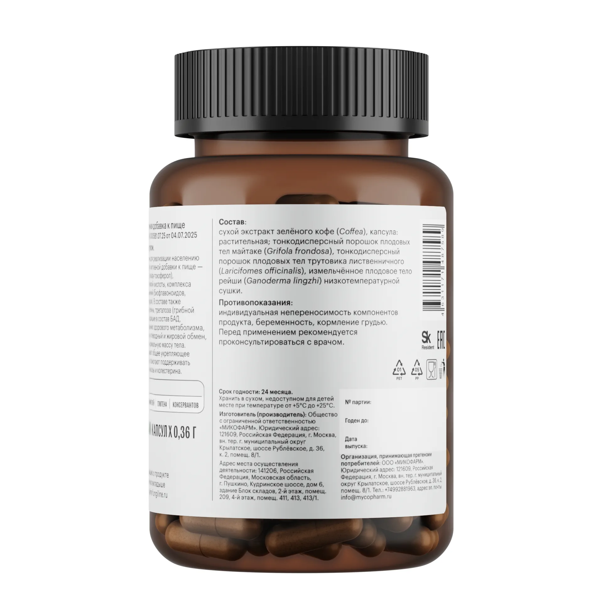 Тонкодисперсный порошок плодовых тел майтаке (Grifola frondosa), трутовика лиственничного (Laricifomes officinalis) и рейши (Ganoderma lingzhi) низкотемпературной сушки; экстракт зелёного кофе (Coffea).